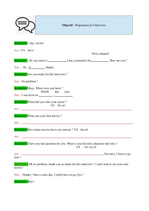 Complete the following card about your star to prepare the interview.